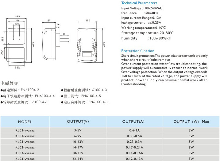 頻率:50/60Hz 輸入電流:0.13A 漏電電流:≤0.25A 工作溫度:0-40℃ 貯藏溫度:-20-80℃ 濕度:10%-80%RH 短路保護(hù): 電源適配器在短路解除時(shí)能正常工作恢復(fù) 過流保護(hù):過流故障排除后,電源將自動恢復(fù)正常工作 過壓保護(hù):當(dāng)輸出電壓超過額定電壓的150-180%時(shí),電源將保護(hù),故障排除后電源能恢復(fù)正常工作" />